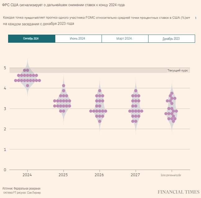 Чиновники дали понять, что не собираются останавливаться на достигнутом: опубликованные в среду прогнозы в виде так называемой точечной диаграммы показали, что большинство членов Федерального комитета по открытым рынкам считают, что ставка снизится еще на полпроцента в этом году, а затем последует серия сокращений в 2025 году, чтобы оставить ставки на уровне 3,25-3,5 процента.