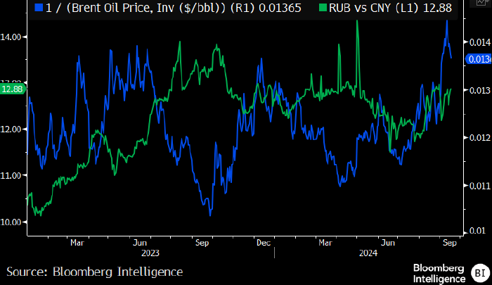Чувствительность рубля к изменению цен на нефть выросла в III кв., и на этом фоне российская валюта показывает наихудшую динамику в сегменте EM. Впрочем, свою роль могли сыграть и другие факторы: расширение санкций, включая ограничения против Мосбиржи и ее инфраструктуры в июне, а также вторжение ВСУ на территорию РФ в августе.