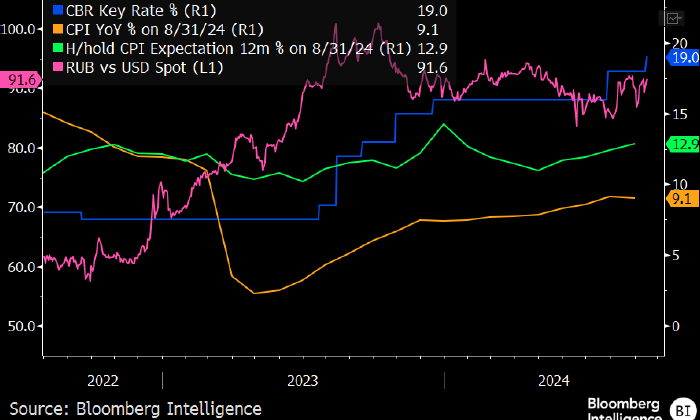 Синим — ключевая ставка ЦБР, оранжевым — ИПЦ в РФ (% г/г), салатовым — инфляционные ожидания домохозяйств на ближайшие 12 месяцев, розовым — курс USDRUB. Источник: Bloomberg