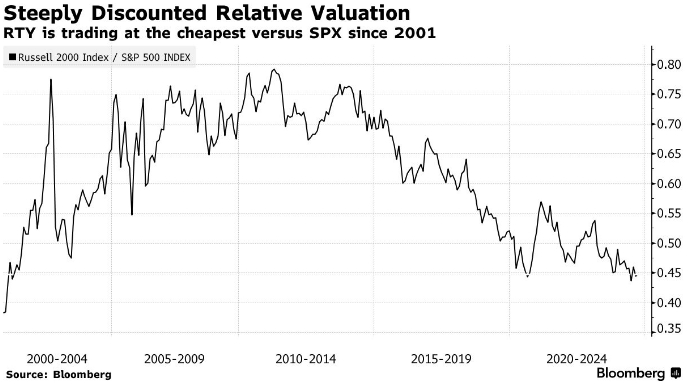 По форвардному показателю отношения цены к объему продаж Russell 2000 торгуется с самым большим дисконтом к S&P 500 за более чем 20 лет.