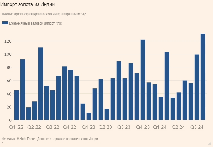 Однако, по словам Харшала Барота, старшего консультанта по исследованиям Metals Focus, этот спрос привел к тому, что внутренние цены на золото в Индии быстро достигают уровня, на котором они находились до снижения тарифных пошлин.