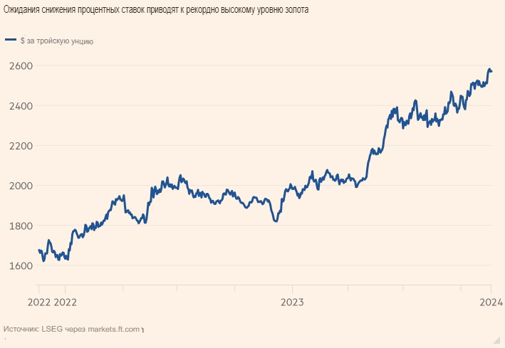 В среду ФРС снизила ставки на полпроцента, что подтолкнуло золото к очередному рекордному максимуму, в районе 2600 долларов.