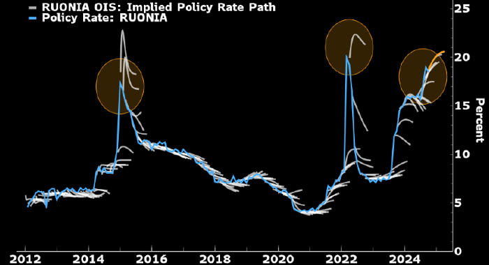 Индикативная ставка по операциям процентный своп на ставку RUONIA (серым (ожидания по ставке)), сама ставка RUONIA (голубым) и прогноз Bloomberg Economics (оранжевым). Источник: Bloomberg