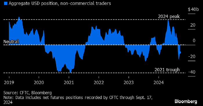 По данным CFTC, на неделе до 17 сентября — т. е. накануне решения ФРС по ставкам — крупные спекулянты занимали чистую короткую позицию по доллару объемом $9,3 млрд. Это примерно на $5,5 млрд меньше, чем неделей ранее, но все равно немало по историческим меркам.