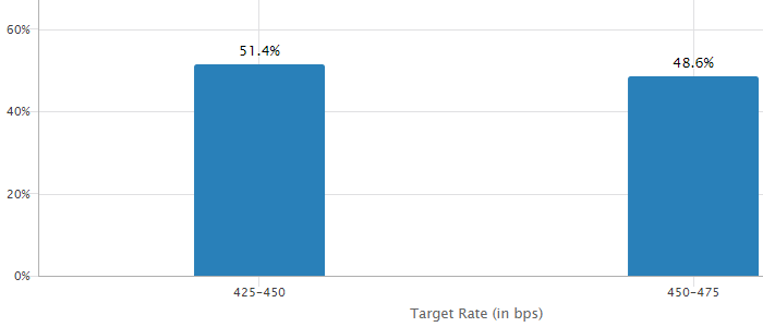 В настоящий момент рынок фьючерсов на ставку по федеральным фондам учитывает в ценах ее снижение с текущих уровней к концу года на 74 б.п. Вероятность ее снижения на заседании FOMC 7 ноября на 25 б.п. или на 50 б.п. оценивается рынком в 48,6% и 51,4% соответственно.