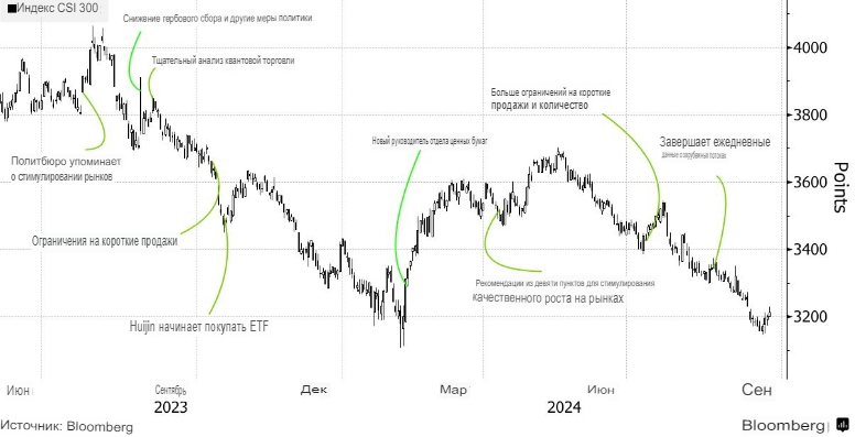 Предыдущие усилия Китая поддержать акции провалились. Индекс CSI 300. Источник: Bloomberg