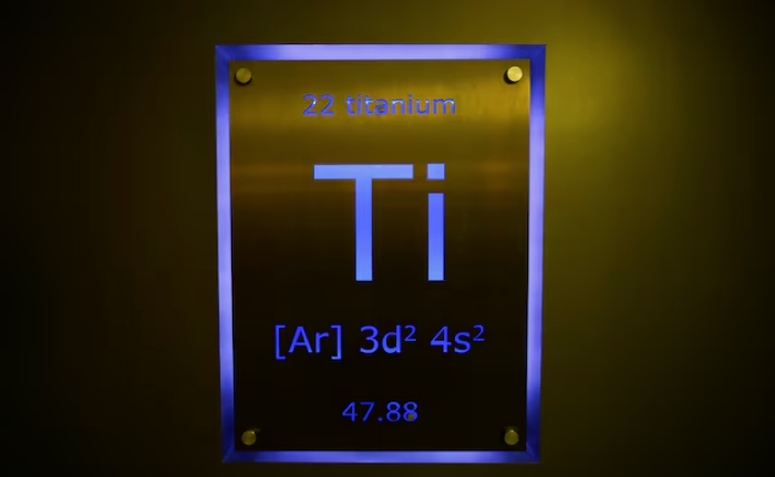 Знак с изображением титана в периодической таблице элементов виден на производственном объекте Nobel Biocare в Йорба Линда, Калифорния 16 мая 2013 года. REUTERS/Mike Blake
