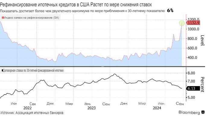 Индекс рефинансирования, рассчитываемый Ассоциацией ипотечных банкиров, достиг максимального значения с апреля 2022 года.