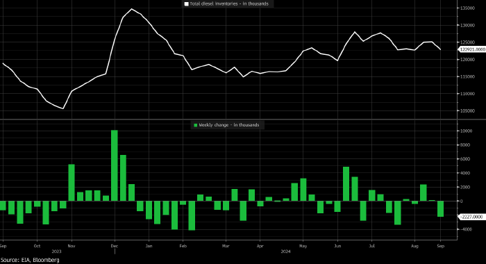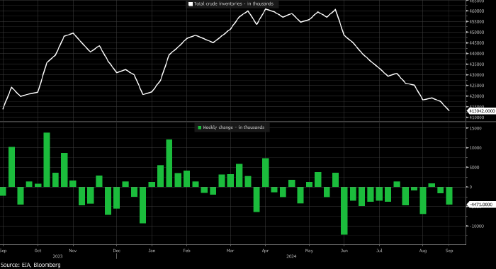 Коммерческие запасы сырой нефти в США (вверху, в тыс. баррелей) и их недельное изменение (внизу, в тыс. баррелей). Данные: Минэнерго США, источник: Bloomberg