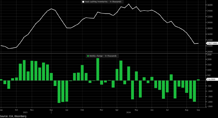 Запасы в Кушинге выросли на 116 тыс. барр., оставшись в области минимального значения с октября 2023 г.