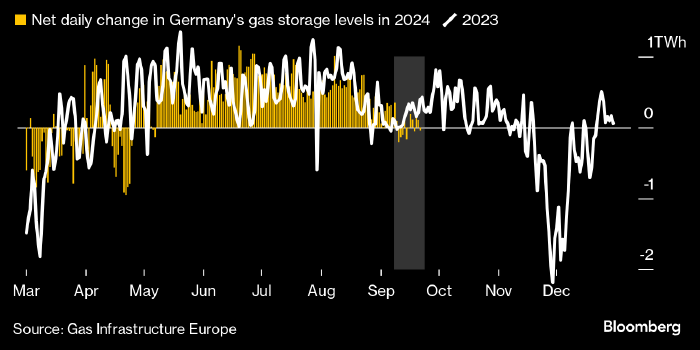 Чистый приток/отток природного газа в хранилищах Германии в 2024 г. (желтым) и 2023 г. (белым). Источник: Bloomberg