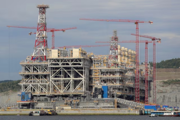 Бетонное основание гравитационного типа (ОГТ) совместного предприятия «Арктик СПГ 2» находится в процессе строительства в сухом доке Центра строительства СПГ недалеко от поселка Белокаменка, Мурманская область, Россия, 26 июля 2022 г. REUTERS/Stringer