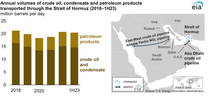 Слева — средний объем перевозки нефти и нефтепродуктов через Ормузский пролив в млн б/д, справа — карта Ближнего Востока с обозначением нескольких нефтепроводов и самого Ормузского пролива. Источник: Bloomberg