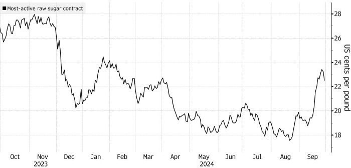 - Фьючерсы на сахар-сырец упали на 2. 5% до 22. 64 цента за фунт