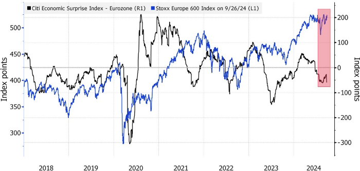 Индекс экономического сюрприза и динамика европейских акций. Источник: Bloomberg