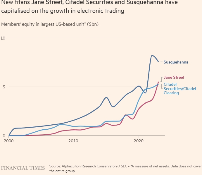 Новые титаны Jane Street, Citadel Securities и Susquehanna извлекли выгоду из роста электронной торговли. Капитал участников в крупнейшем подразделении в США* (млрд долл. США) Источник: Alphacution Research Conservatory / SEC. "Мера чистых активов. Данные не охватывают всю группу»