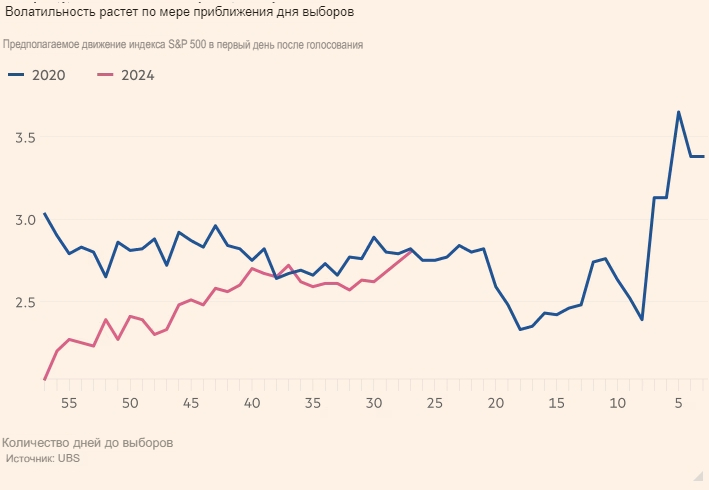 По данным анализа UBS, в настоящее время рынки опционов закладывают в цены примерно 2,8-процентное колебание базового фондового индекса S&P 500 на следующий день после выборов.