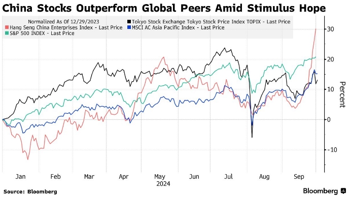 Настроения по отношению к акциям во второй по величине экономике мира резко изменились с начала прошлой недели. Власти представили ряд мер по стимулированию экономики, включая снижение процентных ставок, высвобождение наличных для банков и поддержку ликвидности для акций.