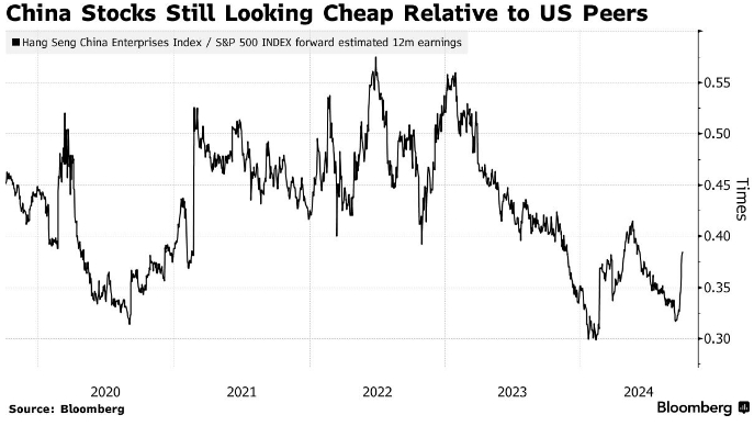 По данным Bloomberg, индекс Hang Seng China Enterprises всё ещё торгуется на уровне, который в 9 раз превышает прогнозируемую прибыль на следующие 12 месяцев. Это составляет примерно половину от показателя S&P 500.