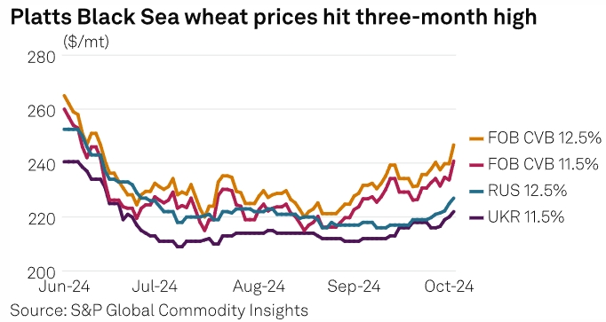 Цена на пшеницу выросла на 4,3% за последние две недели и теперь является самой высокой ценой с 26 июня 2024 года. По состоянию на 3 октября Platts оценила цену на FOB Россия с содержанием протеина 12,5% в $228,50 за метрическую тонну на период с конца октября по первую половину ноября.