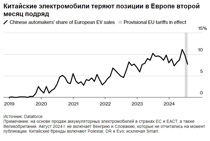 Дополнительные пошлины уже замедлили деятельность китайских автопроизводителей в Европе, их продажи упали на 48% в августе до 18-месячного минимума. Этот регион является привлекательным местом для производителей из Китая, поскольку электромобили продаются в больших количествах и по более надёжным ценам, чем на других экспортных рынках.
