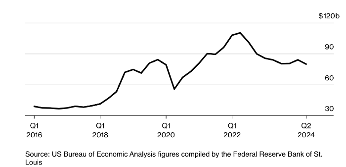 Сколько денег поступает в бюджет США от пошлин на импорт, годовые значения, скорректированные с учетом сезонных факторов. Источник: Bloomberg