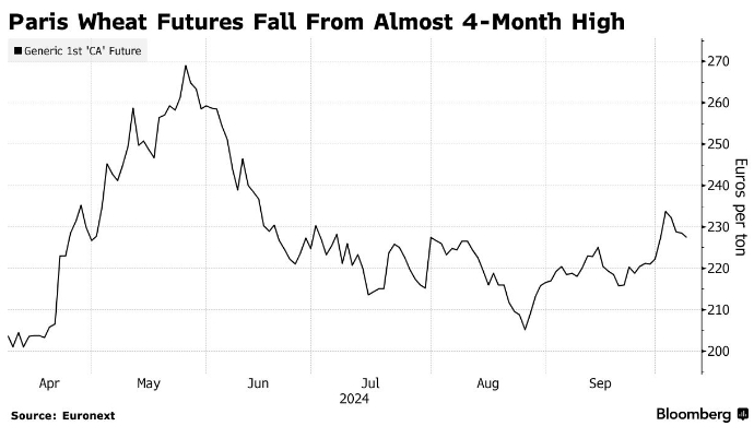Парижские фьючерсы на пшеницу упали на 0,3% до €227,75 за тонну по состоянию на 12:37 по местному времени; цены на кукурузу также снизились. Цены на кукурузу, соевые бобы и пшеницу снизились в Чикаго.