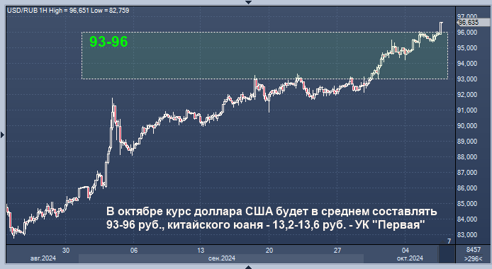 В результате, вероятно, не следует ожидать заметного укрепления рубля в октябре, полагает эксперт. По его мнению, в подобных условиях можно ожидать, что в октябре 2024 года курс доллара США будет в среднем составлять 93-96 руб., китайского юаня - 13,2-13,6 руб.