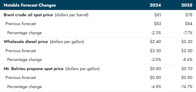 Поскольку спрос на нефть в 2025 году теперь ожидается более низким, прогноз цен на нефть также пересмотрен в сторону понижения. Теперь EIA ожидает, что средняя цена на нефть марки Brent составит $78 за баррель в 2025 году, что на $7 за баррель меньше, чем мы ожидали в STEO за прошлый месяц.