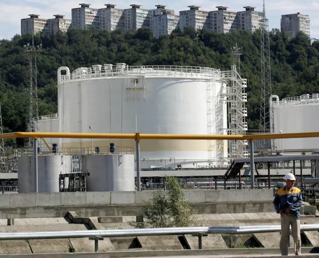 Рабочий стоит перед резервуарами для хранения на нефтеперерабатывающем заводе «Роснефти» в Туапсе на российском побережье Черного моря 6 сентября 2006 г. REUTERS/Сергей Карпухин