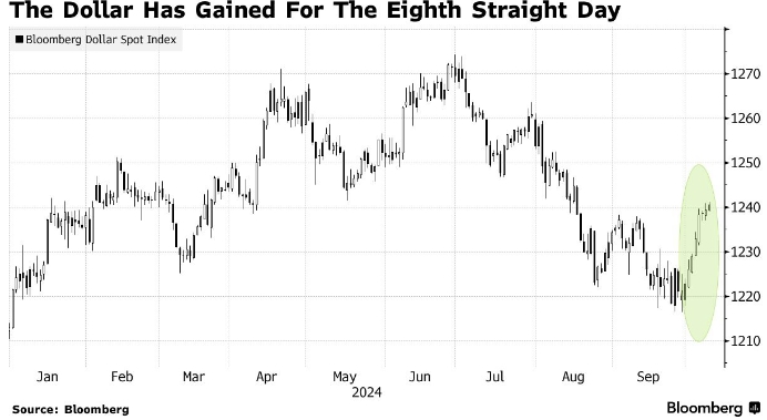 Индекс Bloomberg Dollar Spot вырос в среду восьмой день подряд, демонстрируя самую продолжительную победную серию с апреля 2022 года. За этот период он вырос почти на 2%.
