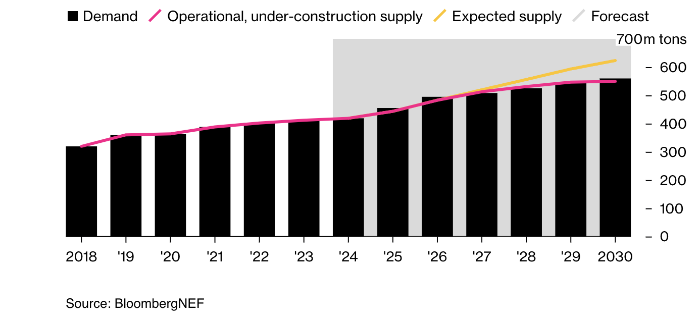 Более того, ожидается, что спрос на СПГ существенно вырастет к концу десятилетия, поскольку бум искусственного интеллекта повышает потребности в энергоемких центрах обработки данных. McKinsey & Co прогнозирует, что потребности ИИ составят 5% энергопотребления Европы к 2030 году, в то время как BlackRock ожидает увеличения потребления энергии в Азиатско-Тихоокеанском регионе примерно на 50% в течение следующих 10 лет. Спрос на газ в энергетическом секторе США может вырасти на 30% к 2030 году по сравнению с сегодняшним уровнем, согласно Bloomberg Intelligence.