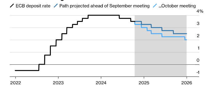 Денежные рынки по-прежнему ожидают, что ЕЦБ снизит ставки на четверть пункта на следующей неделе, их уверенность в последующем снижении в декабре ослабла. Ожидания конечной ставки также выросли: трейдеры теперь видят ее выше 2% к концу следующего года по сравнению с 1,75% неделю назад.
