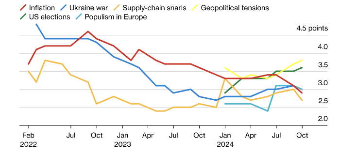 Действительно, надежда на восстановление расходов домохозяйств и инвестиций, а также на оживление мировой торговли, угасает. И в дополнение к этому, респонденты опроса видят крупнейшие экономические риски для Европы, исходящие от геополитической напряженности и потенциального возвращения Дональда Трампа на пост президента США.