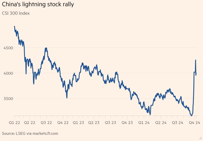 В конце сентября, когда центральный банк Китая объявил о мерах по оживлению рынков акций и недвижимости, многие мелкие инвесторы бросились в рынок, надеясь на прибыль. Базовый индекс CSI 300 вырос на 24% за пять торговых дней, а затем открылся на 11% выше после недельного перерыва.