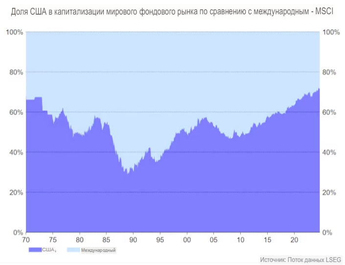 Соответственно, акции США теперь составляют рекордные 72% мировых акций, согласно метрикам рыночной капитализации MSCI. Это выше, чем около 63% до пандемии и на 20 процентных пунктов за чуть более чем десятилетие.