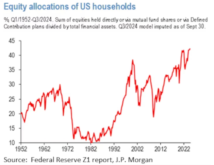 Распределение акций домохозяйств США, %. Q1/1952-Q3/2024. Сумма акций, удерживаемых напрямую или через акции паевых инвестиционных фондов или через планы с установленными взносами, деленная на общие финансовые активы. Модель Q3/2024, вмененная по состоянию на 30 сентября. Источник: отчет Федеральной резервной системы Z1, J.P. Morgan
