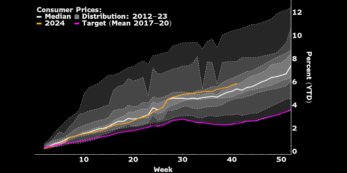 Потребительская инфляция в РФ в % г/г по неделям года: белым — медианное значение, серым — разброс в 2012—2023 гг., оранжевым — текущая динамика (2024 г.), фиолетовым — целевой уровень (среднее значение в 2017—2020 гг.). Источник: Bloomberg