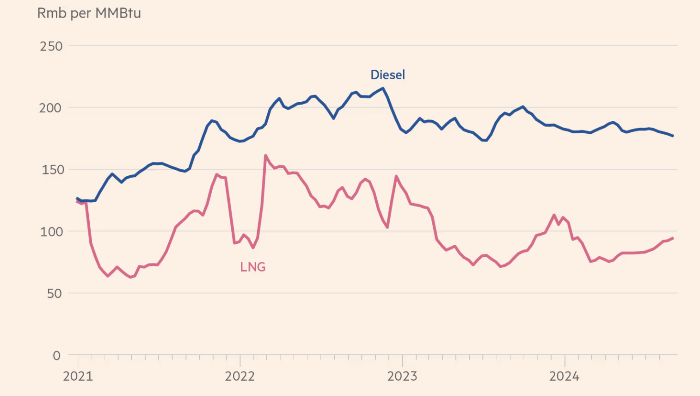По оценкам Financial Times, Китай платит около $8 за млн британских тепловых единиц за трубопроводный газ, что намного меньше, чем за импорт СПГ морским путем. Фунг сказал, что ранее в этом году важнейший «период окупаемости» для покупателей грузовиков на СПГ был на год быстрее, чем для дизельных, несмотря на то, что они примерно на 25% дороже.