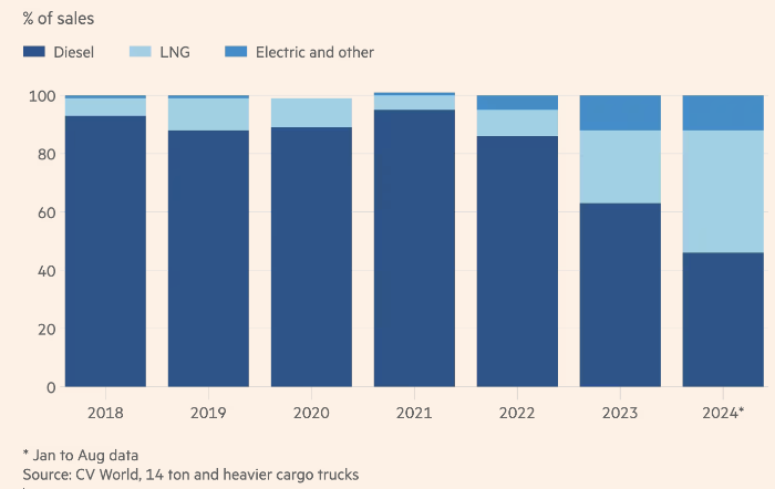 Аналитики говорят, что быстрый рост числа грузовиков на природном газе, особенно тяжелых транспортных средств массой 14 тонн и выше, помог Китаю пройти пик спроса на дизельное топливо и приблизиться к достижению пикового спроса на нефть. Эта тенденция ударила по немецкой Daimler Truck, которая сосредоточилась на совершенствовании дизельных двигателей и создании электрических и водородных двигателей для будущего.
