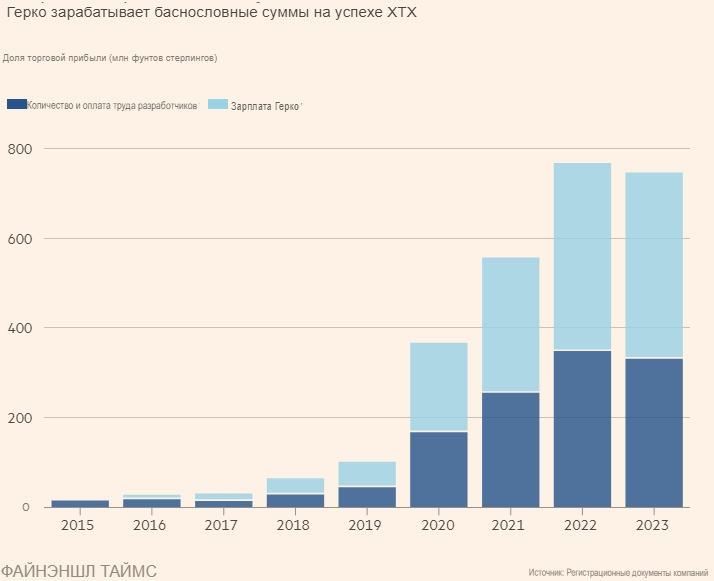 В прошлом году XTX получила прибыль в размере 1,5 млрд фунтов стерлингов от деятельности своих компаний в Великобритании и Сингапуре, а Герко и небольшая группа аналитиков и разработчиков разделили прибыль в размере 747 млн фунтов стерлингов, как следует из документов.
