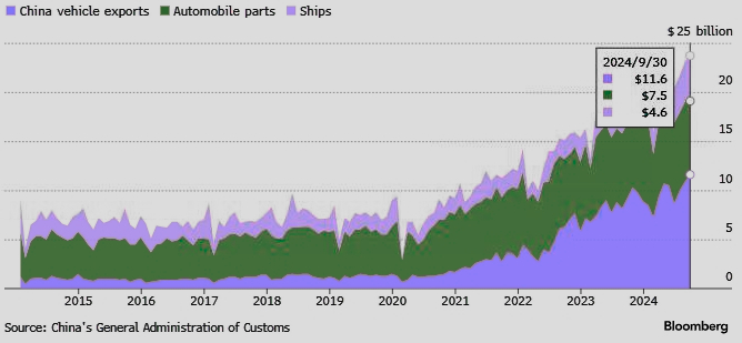 Экспорт автомобилей и судов из Китая в сентябре 2024 г. достиг рекордных показателей, несмотря на то, что более широкие объемы поставок замедляются, что подчеркивает быстрые изменения в промышленности страны, которые подпитывают напряженность в мировой торговле.