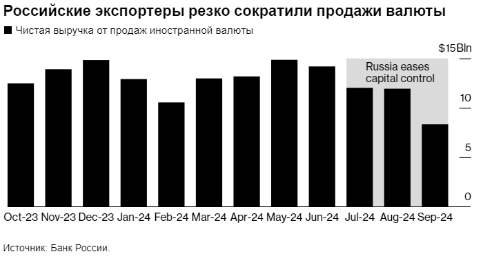 По данным Банка России, в сентябре продажи валюты крупнейшими российскими экспортерами сократились на 30% по сравнению с предыдущим месяцем, поскольку все большая часть расчетов осуществлялась в рублях.