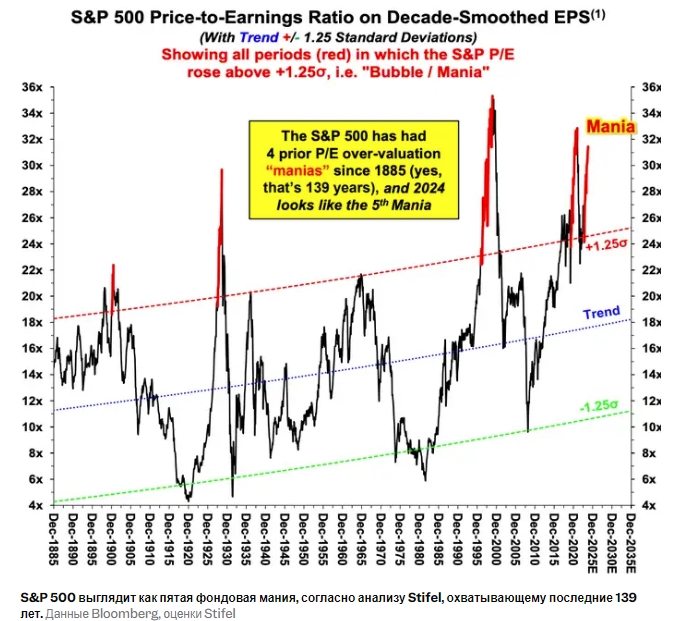 Согласно анализу Stifel, охватывающему последние 139 лет, S&P 500 выглядит как пятая фондовая мания.