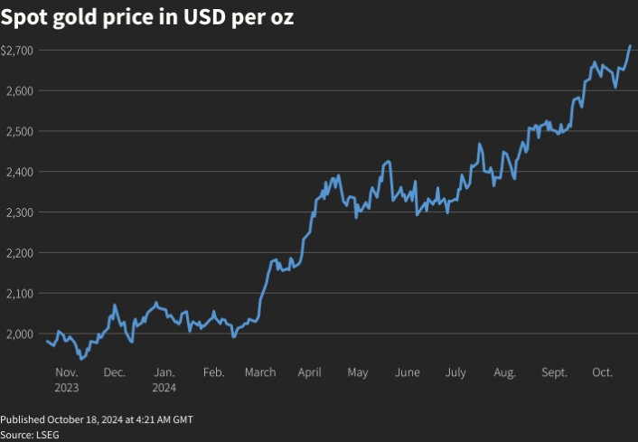 В пятницу цена на золото впервые в истории превысила отметку в 2700 долларов за унцию. Это произошло из-за того, что напряжённая обстановка в США в преддверии выборов и обострение ситуации на Ближнем Востоке усилили спрос на активы, которые считаются надёжными. Кроме того, более мягкая денежно-кредитная политика также способствовала росту цен.