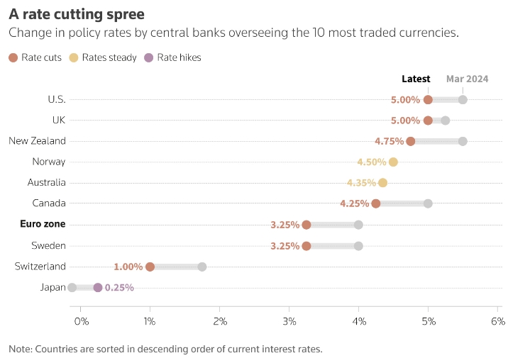 Точечный график показывает процентные ставки центральных банков стран G10 на 1 марта 2024 года и 17 октября 2024 года. Точка на 17 октября для стран, которые начали снижать ставки, обозначена оранжевым цветом, для стран, которые сохраняют стабильные ставки, — желтым, а для стран, которые повышают ставки, — фиолетовым