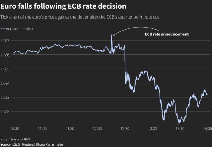 График цены евро по отношению к доллару после снижения ставки ЕЦБ на четверть пункта