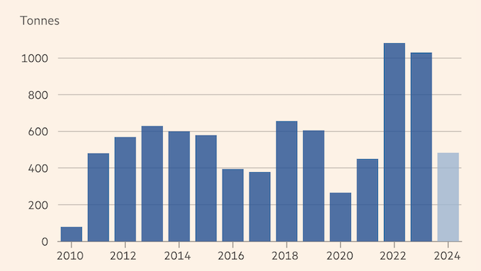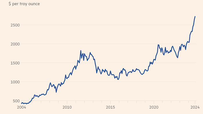 Цены на золото несколько раз обновили исторический максимум в 2024 году. Источник: The Financial Times