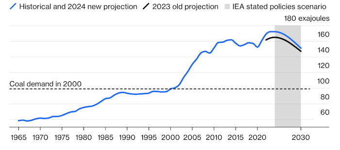 Пересмотр был немаленький: потребление угля в 2030 году теперь оценивается на 6% выше, чем всего год назад. Это равносильно добавлению эквивалента потребления Японии, четвертого по величине потребителя угля в мире. К 2030 году МЭА теперь полагает, что потребление угля останется выше, чем оно было в 2010 году.