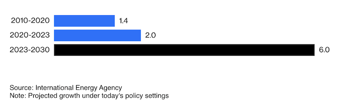 Да, чистая энергия - это будущее. Но в настоящем у нас по-прежнему ископаемое топливо - особенно когда спрос на электроэнергию ускоряется так быстро. Между 2023 и 2030 годами ожидается, что потребление электроэнергии будет расти в шесть раз быстрее, чем общий спрос на энергию, по сравнению с двукратным ускорением в период 2010-2023 годов и 1. 4-кратным ускорением в 2000-2010 годах. По данным МЭА, эквивалент использования электроэнергии 10 крупнейших городов мира ежегодно добавляется к глобальному спросу.